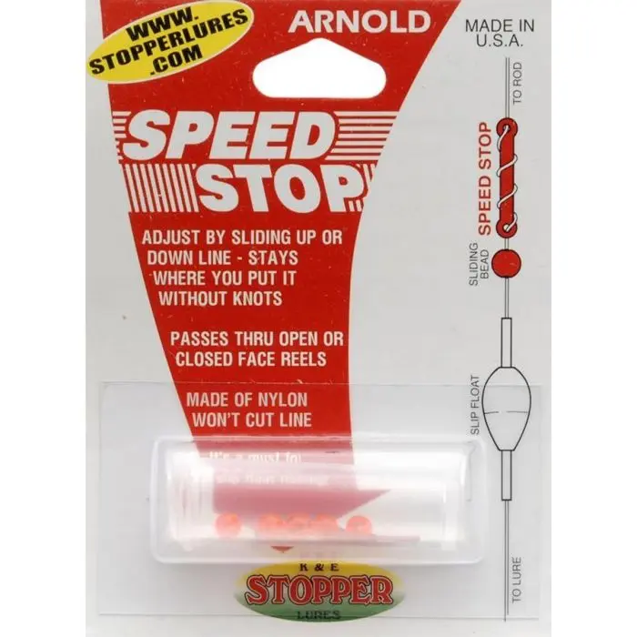 Arnold Bobber Stops – Speed Stops: A must for slip float fishing. Passes through open or closed face reels. Made of nylon, won’t cut line. Adjusts by sliding up or down line.