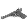 The Ruger Mark IV 22/45 22Lr rimfire pistol features a 5.5″ bull barrel, fully adjustable target sights and the light weight polymer “22/45” grip frame that matches the grip angle of the popular 1911-style pistol. Checkered plastic grip panels can be swapped out with other available styles. Like all Ruger Mark IVs, the 22/45 features one-button disassembly, an ambidextrous manual safety and comes with two drop-free magazines.
